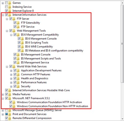 Next, make sure to install IIS7 and Microsoft .NET 3.5 SP1. Go to Control Panel>Programs>Turn Windows features on and off and check the appropriate options.